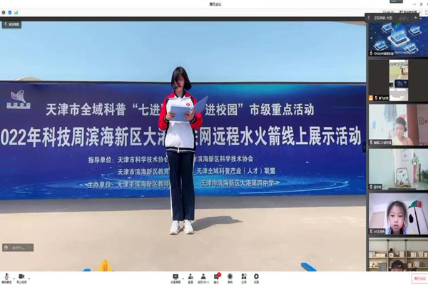 活动现场举办了简短的开幕仪式,播放了天津全域科普、滨海新区大港第四中学科技教育成果宣传片,参加线下活动的学生代表对水火箭原理进行了介绍,科技辅导员详细科普了专用水火箭设备的使用方式,并进行了数轮实操演示。随后50多名特邀嘉宾、科技辅导员和学生参与了网络互动发射。
